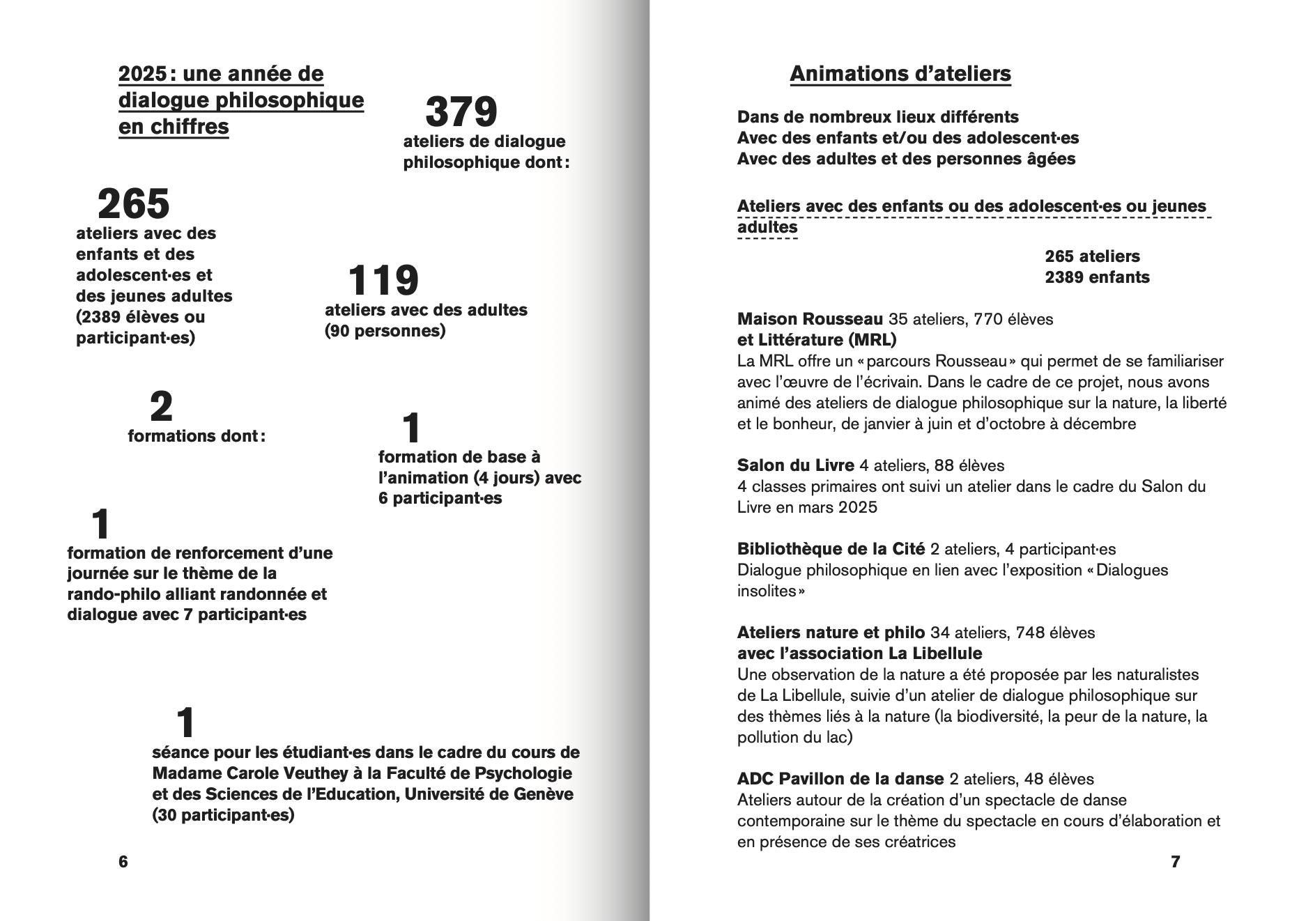 - Des ateliers philo pour s’entraîner à penser in Bibliothèques municipales de la Ville de Genève, printemps 2025